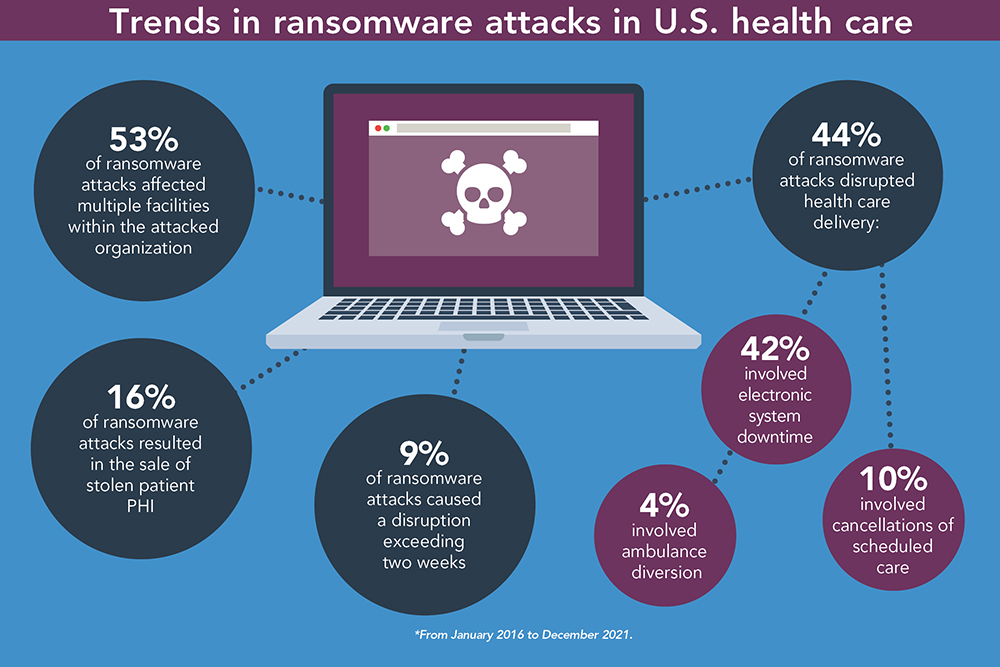 Ransomware is on the rise. A recent JAMA Health Forum study found that the annual number of ransomware attacks on health care organizations more than doubled from 2016 to 2021, exposing the personal health information (PHI) of nearly 42 million patients.