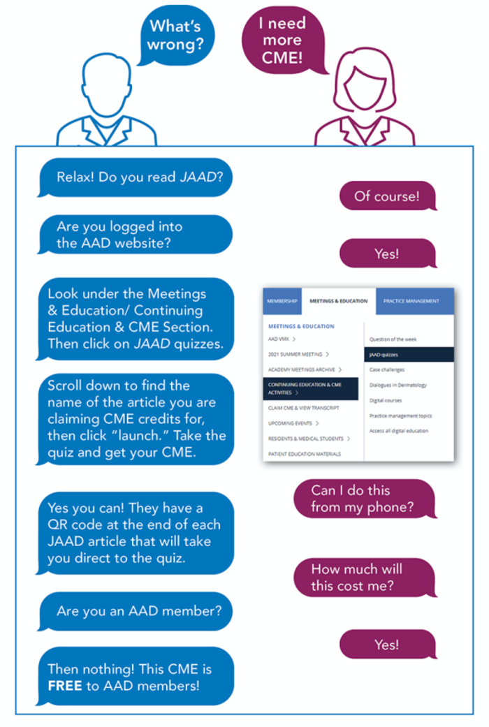 One of the prime benefits you receive with your AAD membership is access to CME. JAAD provides several excellent opportunities to get free CME by reviewing materials and answering questions. How do you do this? We have a short conversation that explains it all for you!
