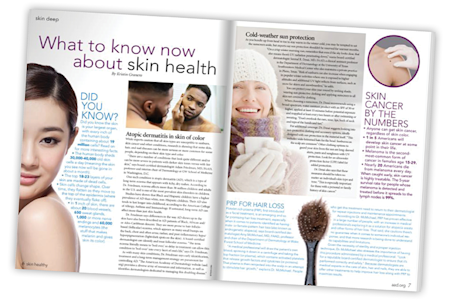 More than 12,000 U.S. AAD members have received the first issue of AAD’s skin healthy, a new magazine to educate your patients about the common skin conditions you treat, and we encourage you to share this valuable resource during patient visits. All content is reviewed by members of the AAD’s Public Education Committee and Web Content Workgroup to ensure it features the most up-to-date recommendations on protecting and keeping your patients’ skin healthy year-round and stresses the importance of seeing a board-certified dermatologist.